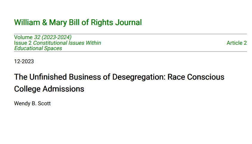 William & Mary Bill of Rights Journal, 2024 | This article contends that the nexus between specific evidence of past discrimination against African Americans in K–12 and continuing discrimination in access to higher education justifies considering race in college admissions policies. | Read more here available from SSRN |