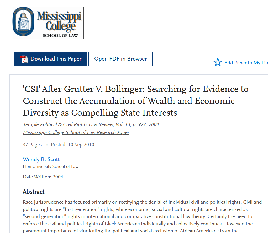Wendy B. Scott, CSI After Grutter v. Bollinger: Searching for Evidence to Construct the Accumulation of Wealth and Economic Diversity as Compelling State Interests |